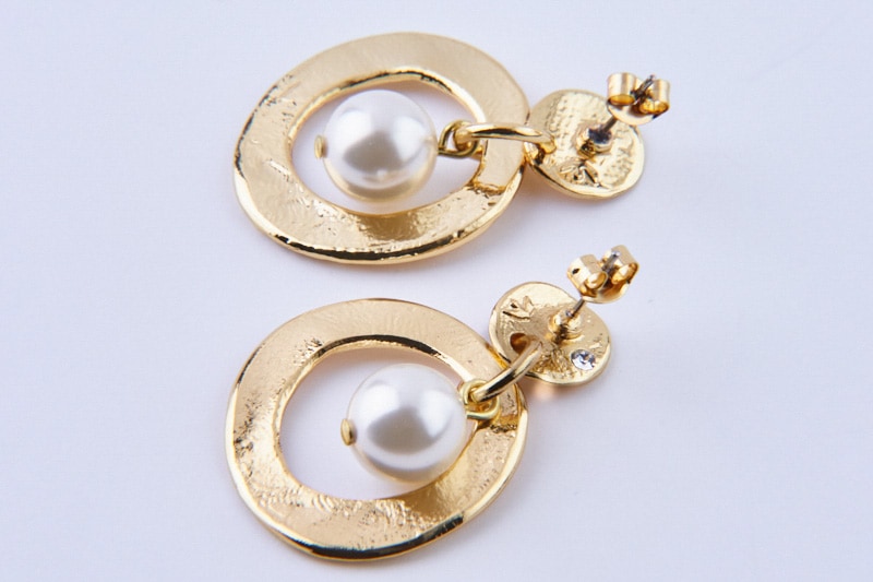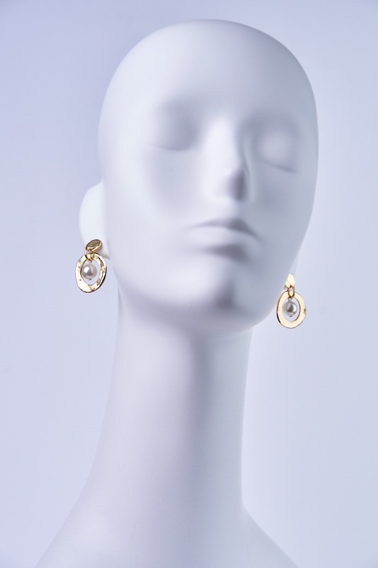 滑らかな光沢が目を引くゴールドピアス。リングの間に揺れるパールがアクセントになっています。