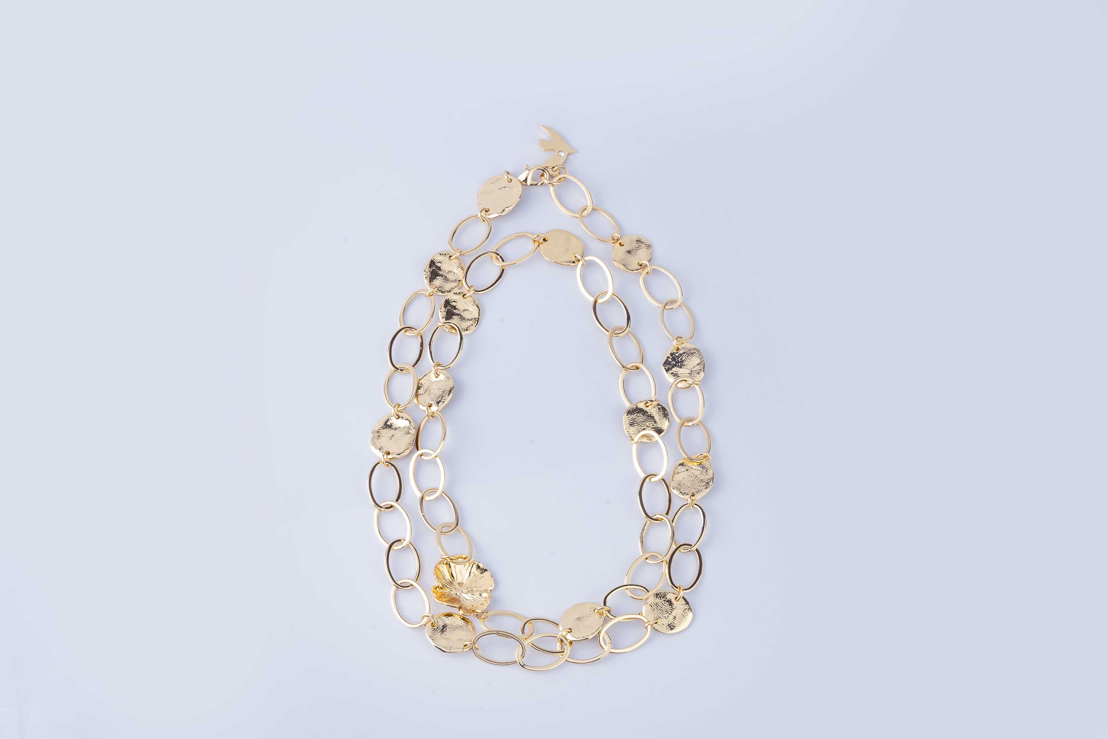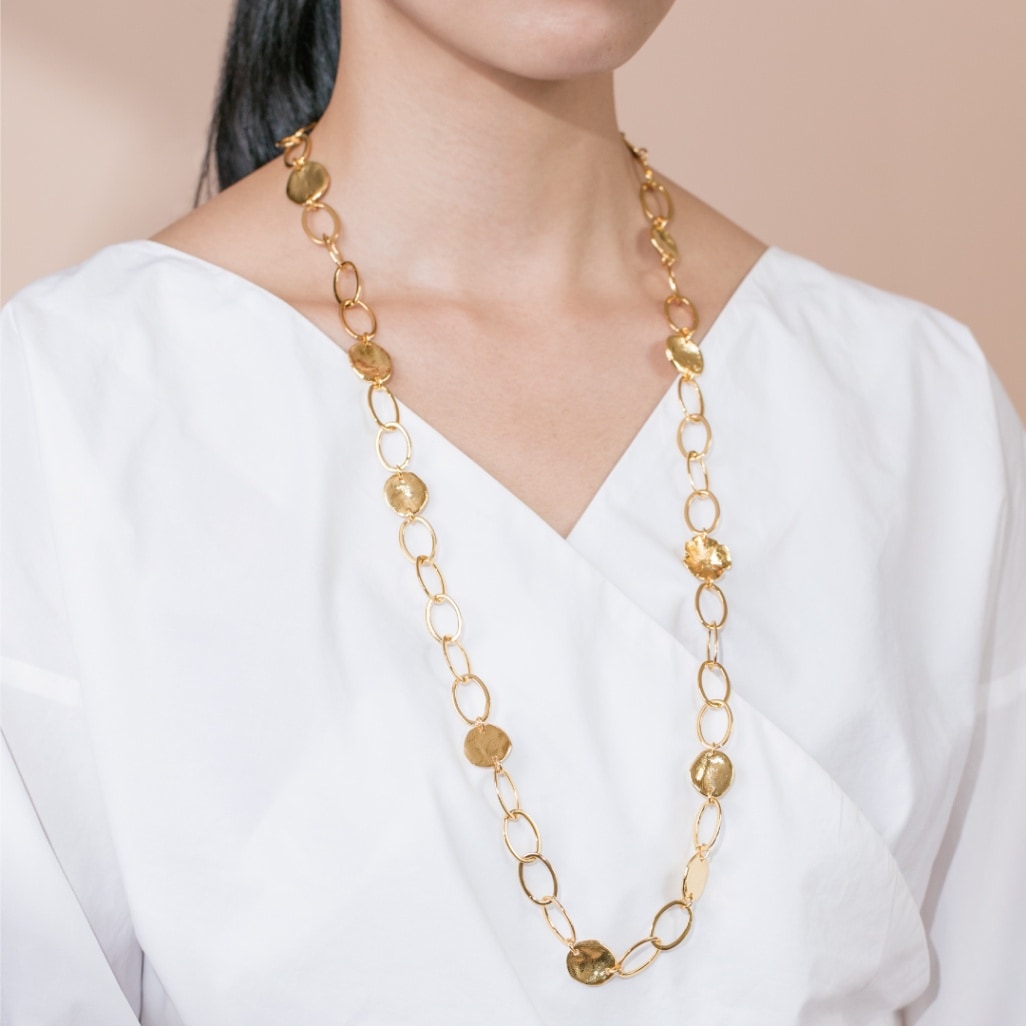 職人のハンドメイドにより一点ずつ表情が異なるプレートと、精巧なカットアウトチェーンの組み合わせは、留める位置で長さを変えたり、二重巻きや、ベルトとしてもお使いいただける優れたデザインです。