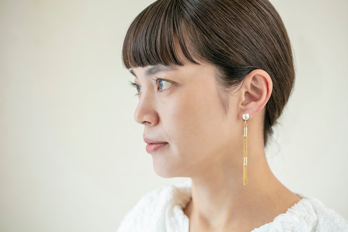 動くたびに耳元でさりげなくゆれるフリンジが横顔を効果的に印象づけてくれます。華やかな印象のジュエリーは1つつけるだけでコーディネートのポイントに。