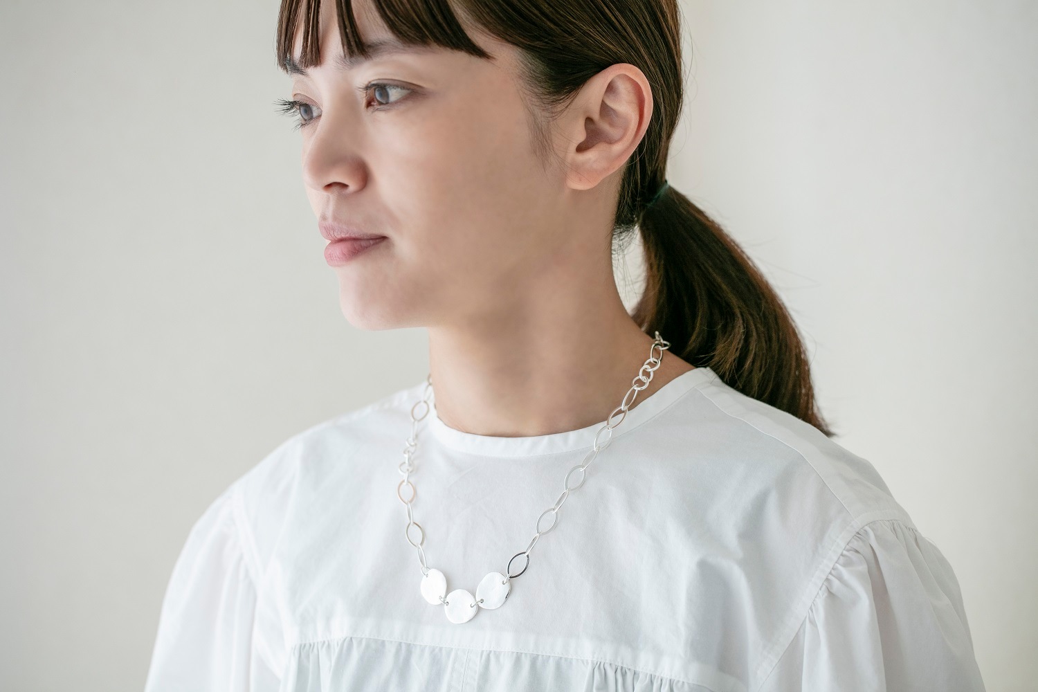 精巧なカットアウトチェーンに、一点ずつ表情が異なるハンドメイドのプレートを組み合わせた贅沢なネックレス。