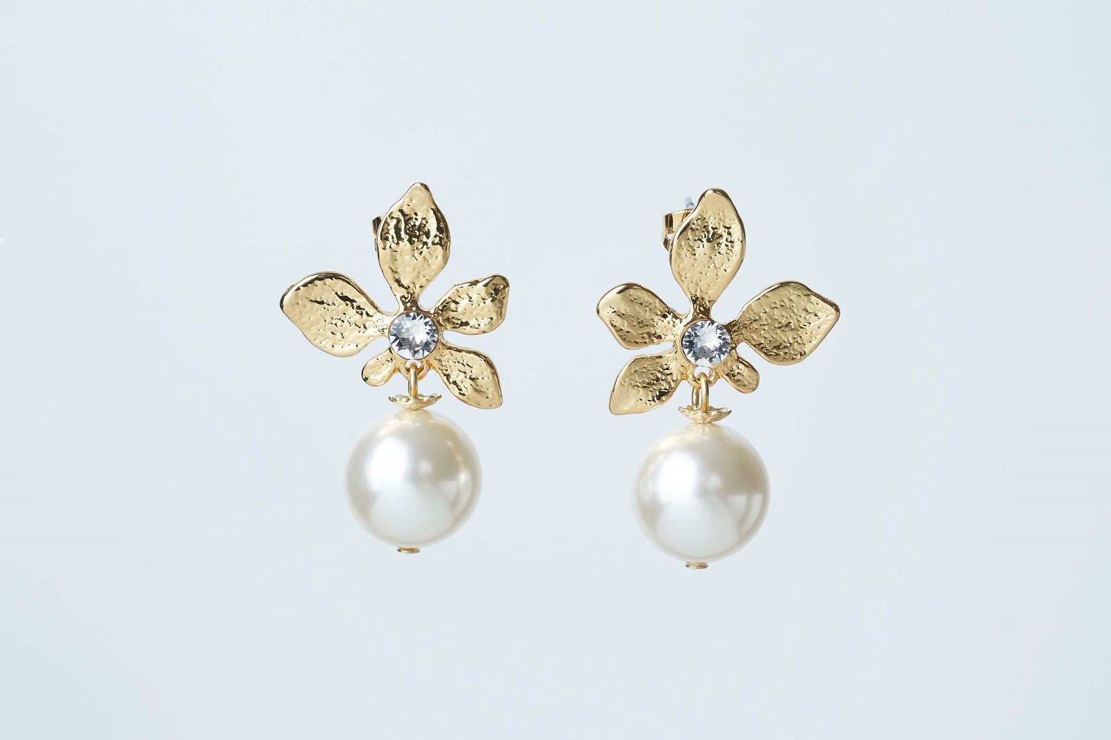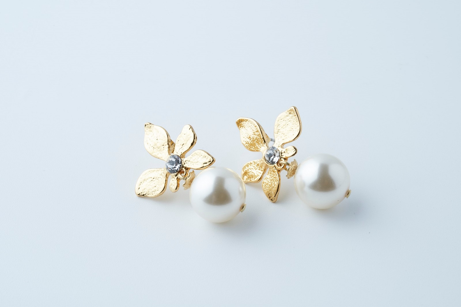 "フルール"="花"のとおり、花びらの中央でひかえめに光るクリスタルとパールの組み合わせが、身に付ける人の女性らしさを引き立ててくれる上質なピアス。