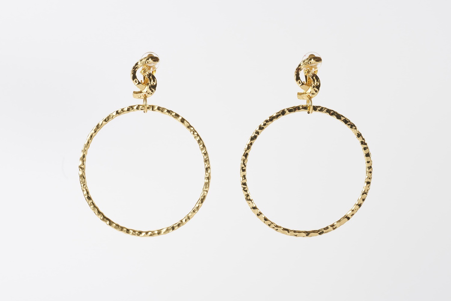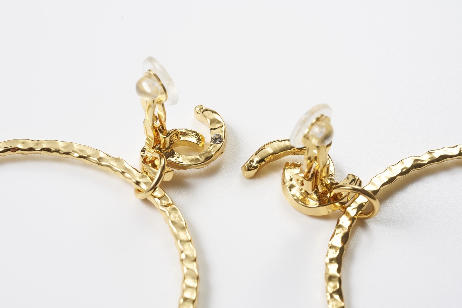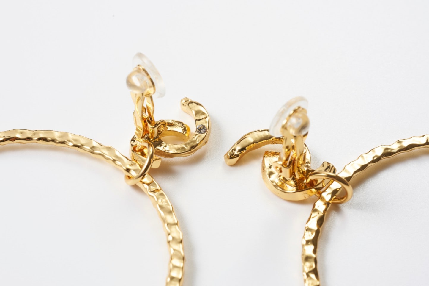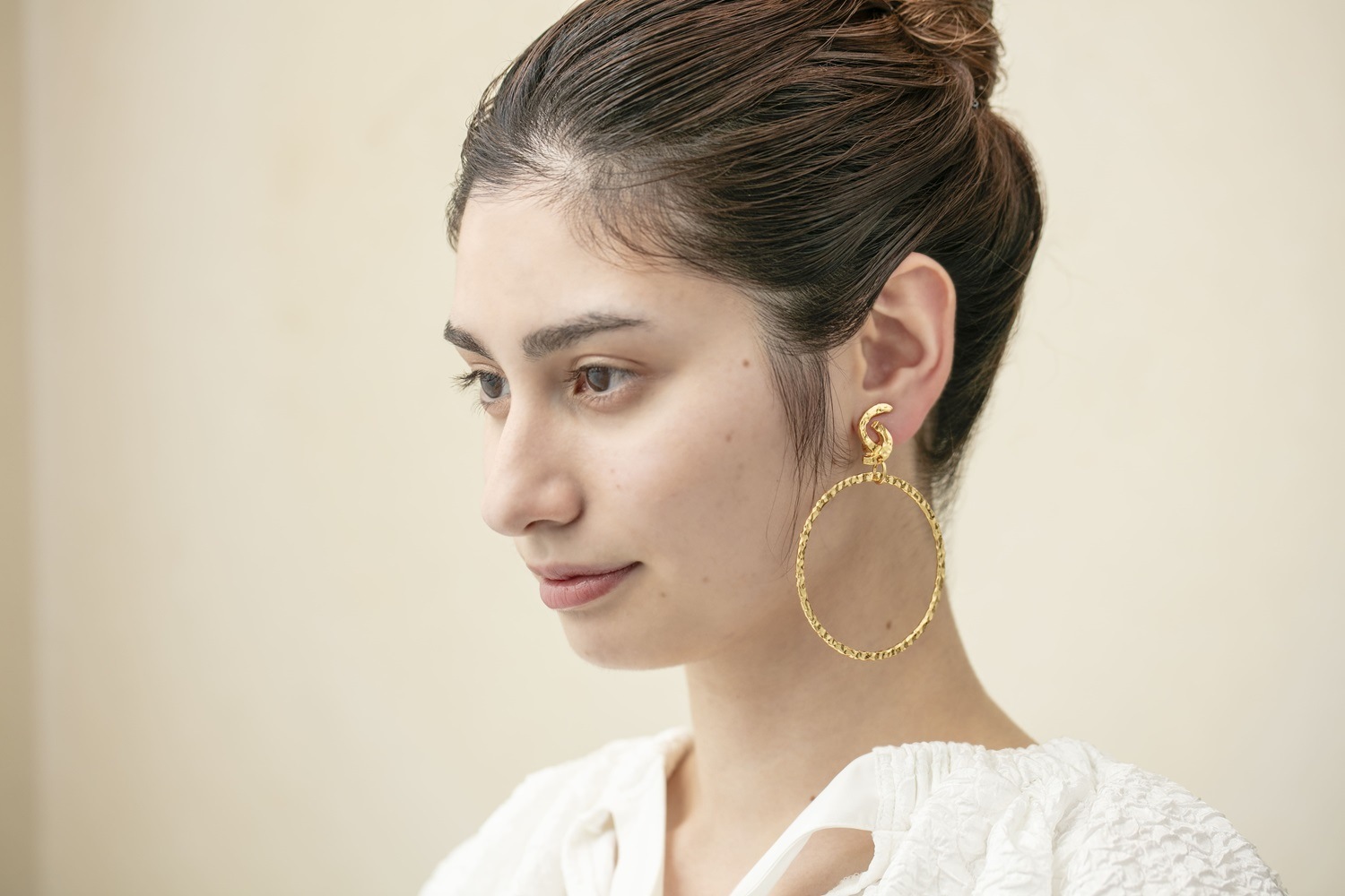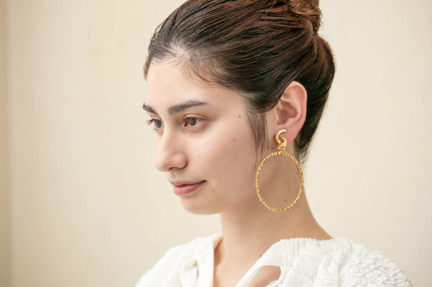 上質な24金でコーティングされたゴールドの大きなフープが印象的なイヤリング。緻密に繋がれたゴールドが光を細かに反射し、顔回りを美しく輝かせます。