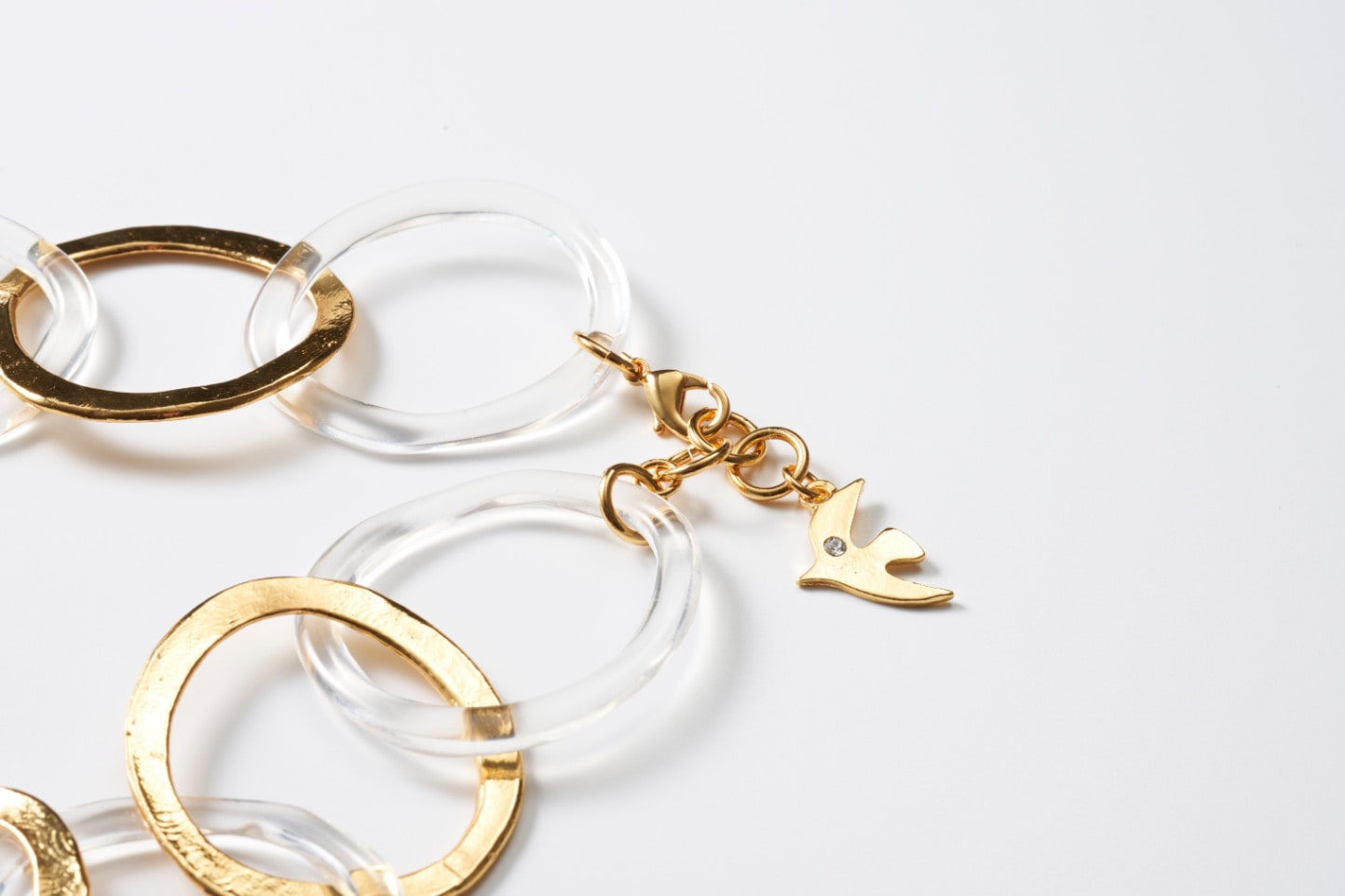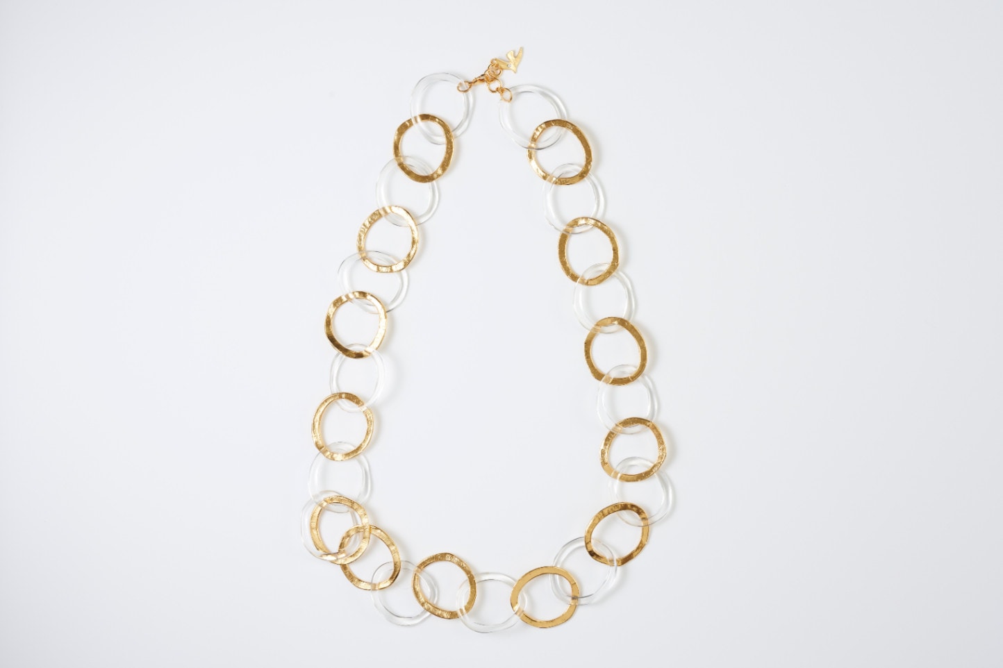 樹脂のフープと大振りの24金コーティングのフープが連なる、大胆なデザインのネックレスが登場。軽やかでフェミニンな素材と色のミックスは、あらゆるコーディネートの主役になりそう。