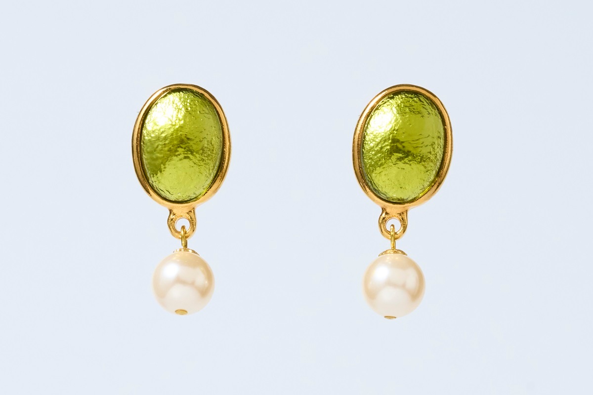 ヴィンテージガラス パールドロップピアス M グリーン