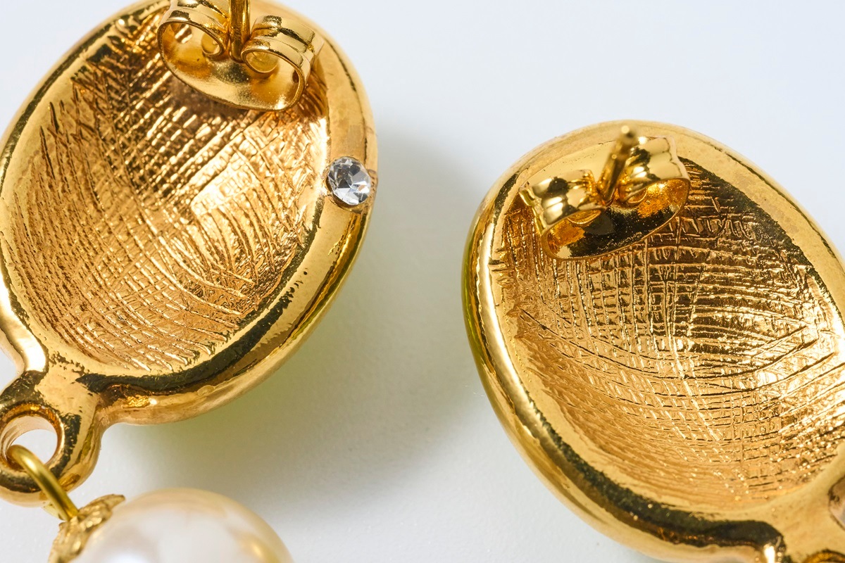 - サイズ=縦3.6㎝ 横1.6㎝ 素材=真鍮/24金コーティング/ガラス/ガラスパール