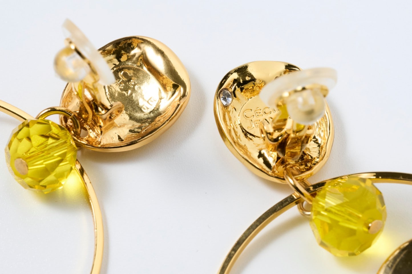 細かなファセットのヴィンテージガラスが光を受けてきらめき、思わず目を奪われる優美なイヤリング。透明感と深みが混在する美しいガラス、華奢なゴールドのリングに浮かんでいるようなデザインも、全てフランスの伝統的な技法で作られた上質な素材と職人技で成り立っています。