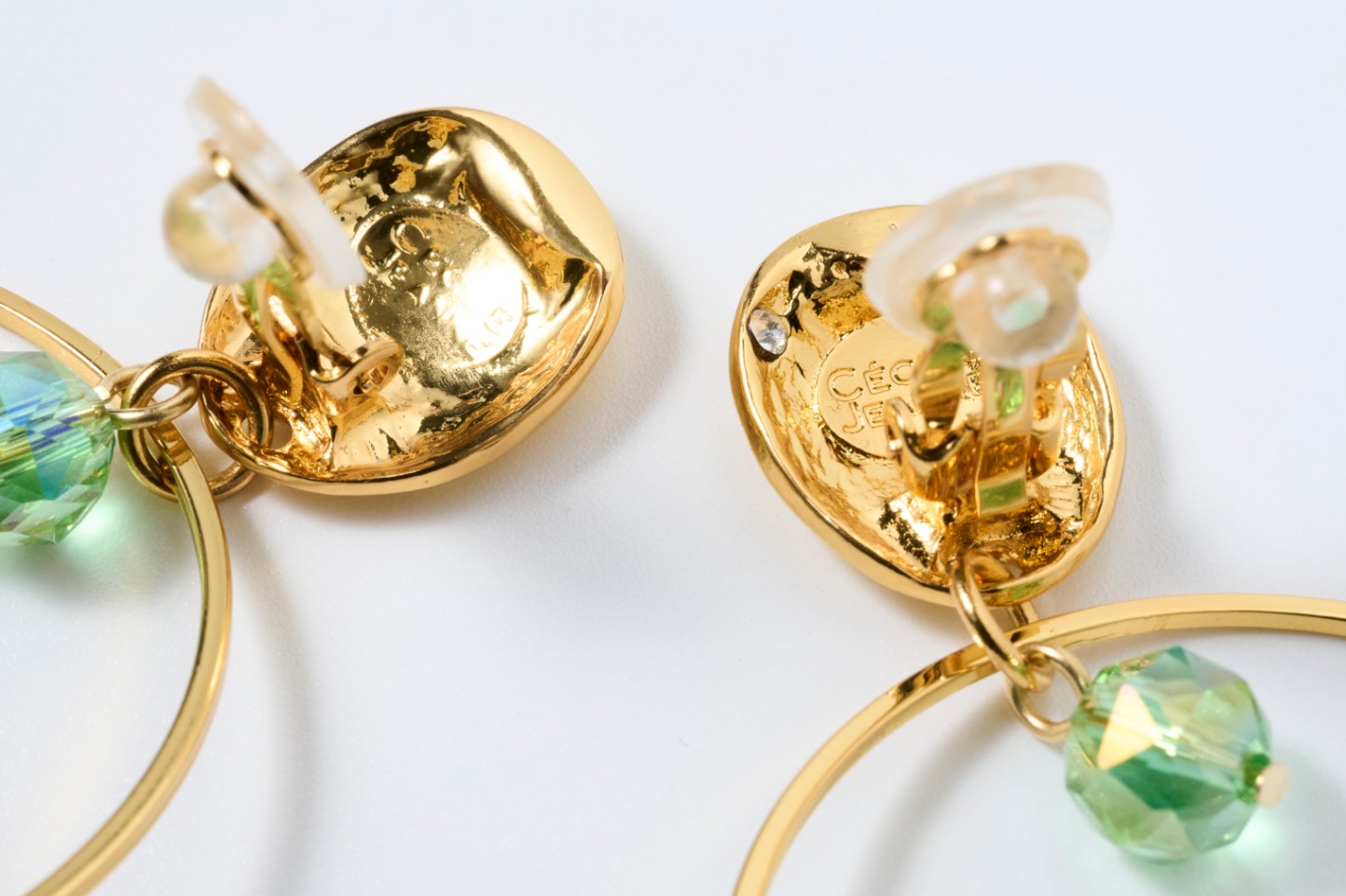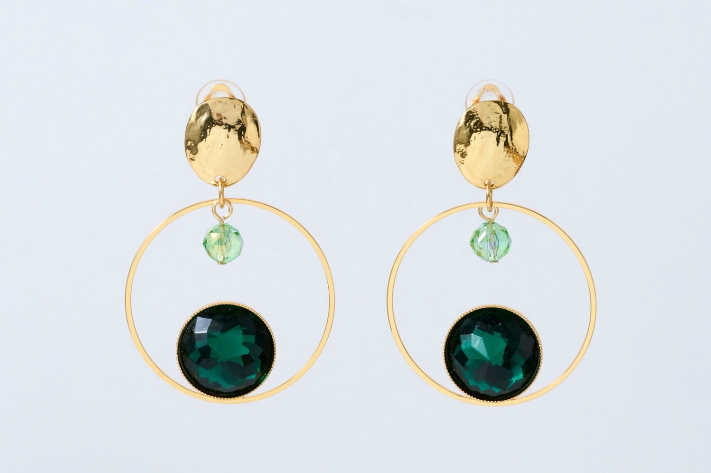 細かなファセットのヴィンテージガラスが光を受けてきらめき、思わず目を奪われる優美なイヤリング。透明感と深みが混在する美しいガラス、華奢なゴールドのリングに浮かんでいるようなデザインも、全てフランスの伝統的な技法で作られた上質な素材と職人技で成り立っています。