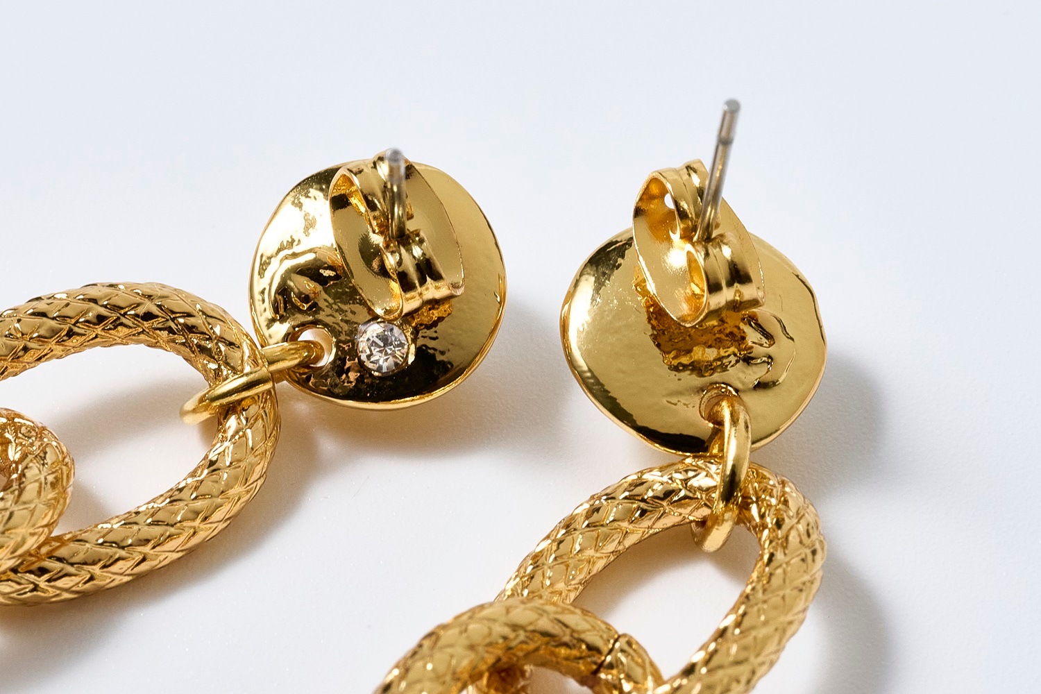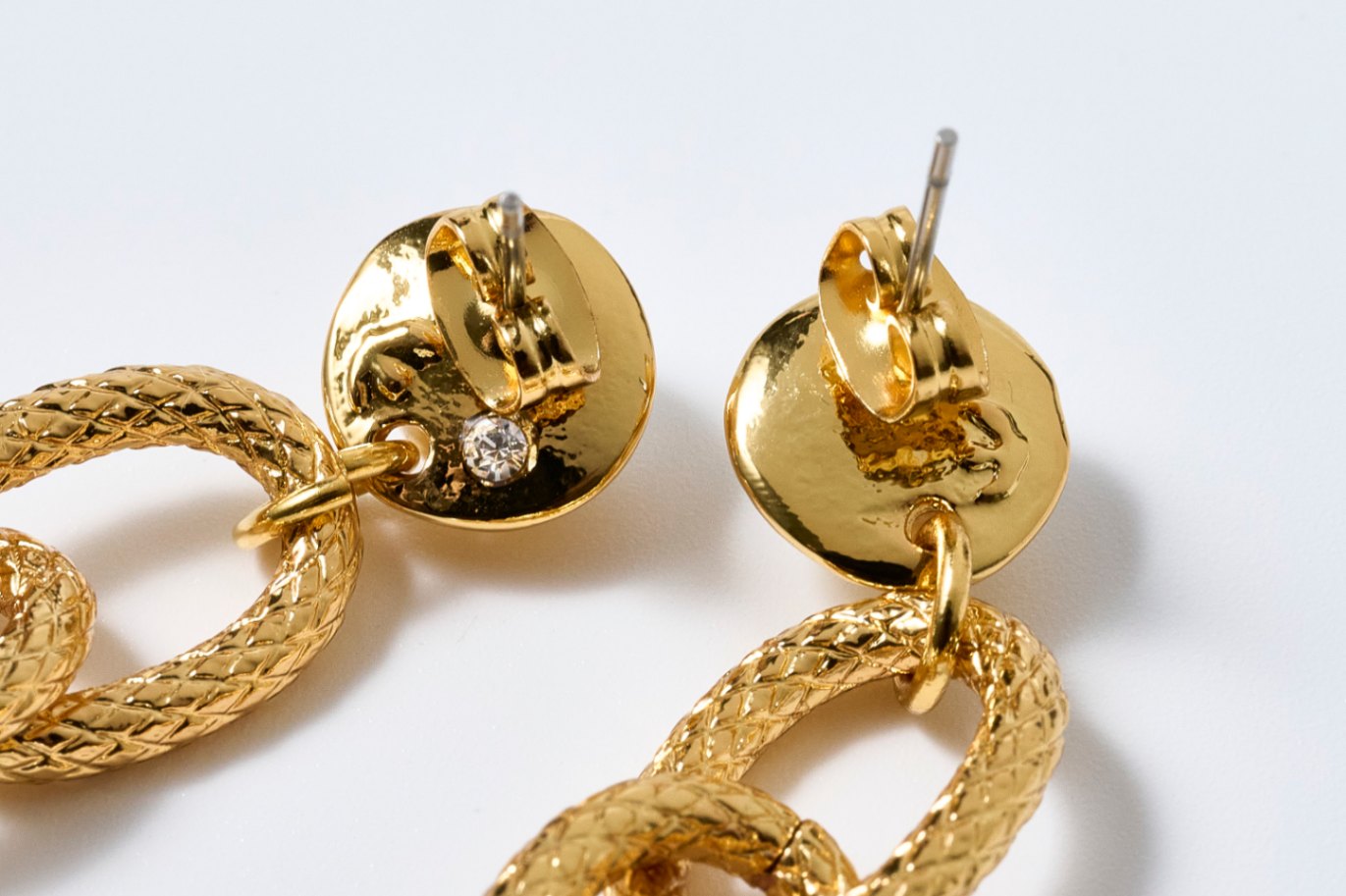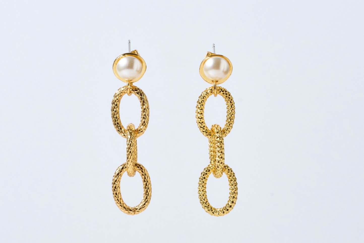 繊細に紡がれたゴールドのチェーンが柔らかに光をまとい、高級感に温かみをもたらすピアス。
