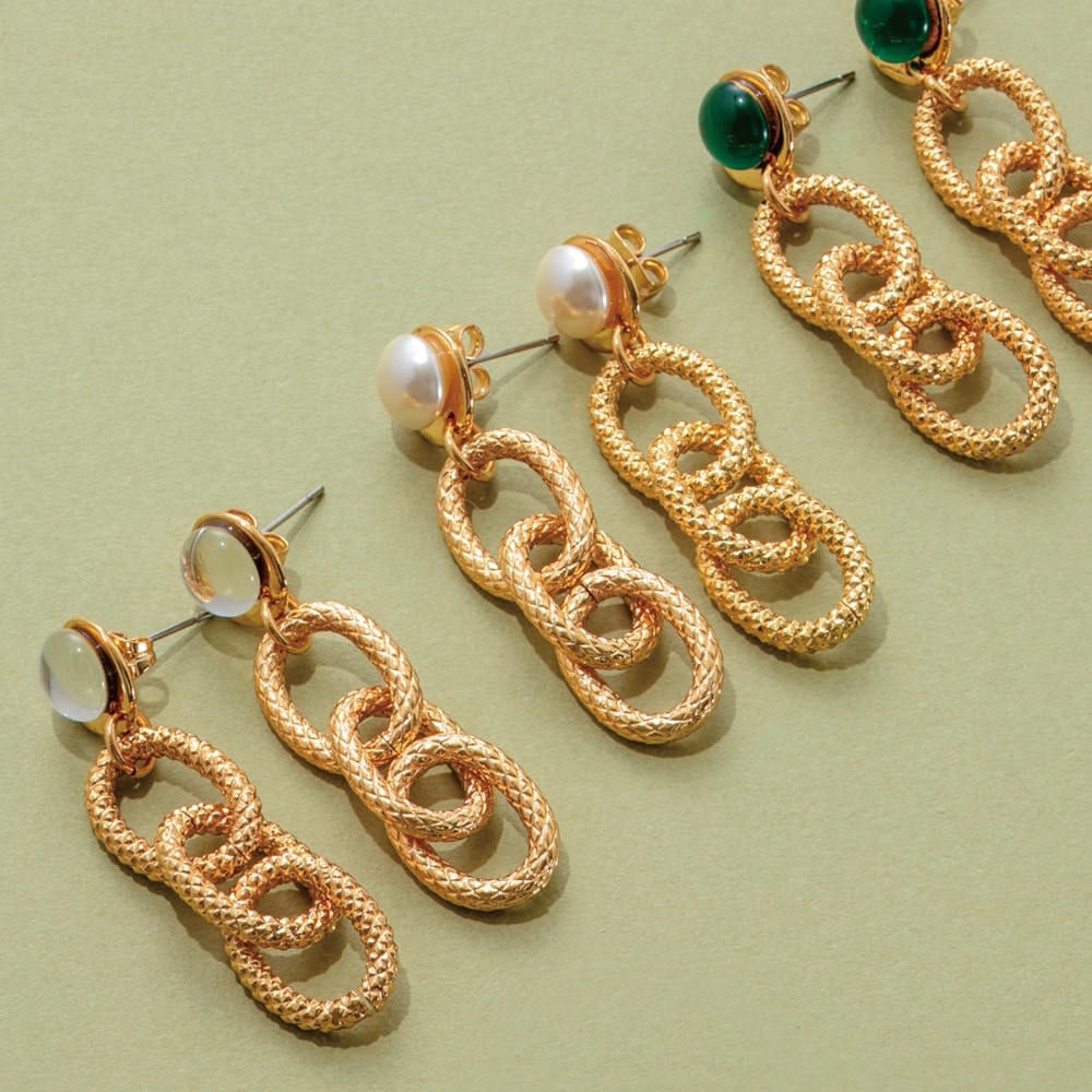 揺れるチェーンの上部にはガラスパールがあしらわれ、一年中顔まわりに光をもたらし、明るく照らしてくれるような華やかなデザインです。