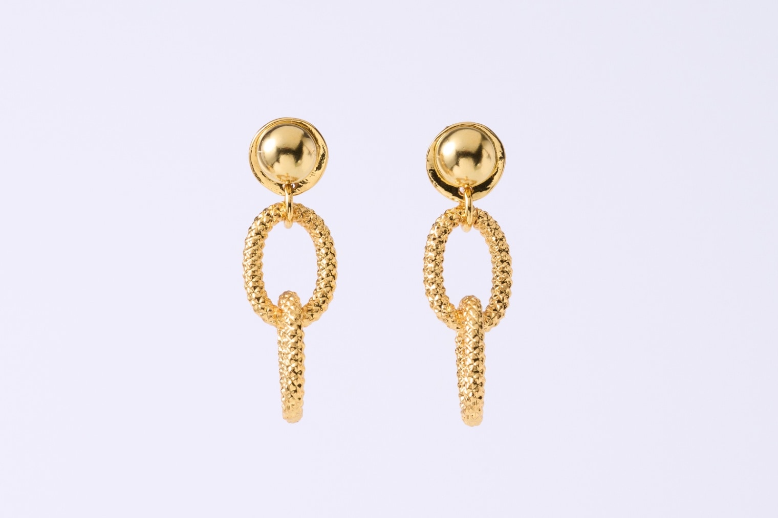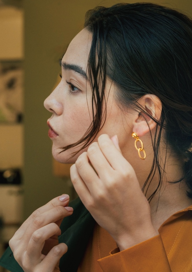 揺れるチェーンの上部にはゴールドパーツがあしらわれ、一年中顔まわりに光をもたらし、明るく照らしてくれるような華やかなデザインです。
