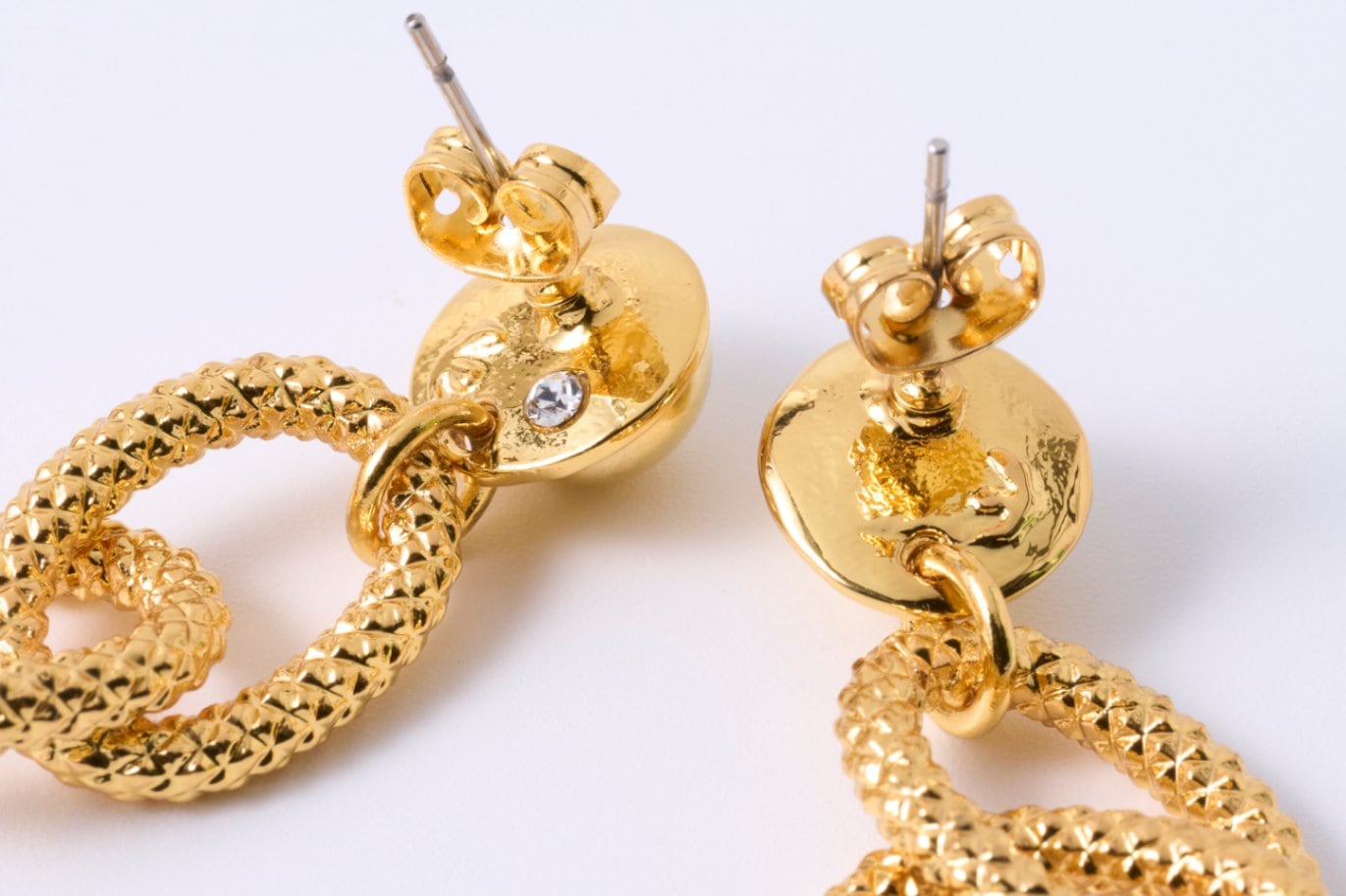 繊細に紡がれたゴールドのチェーンが柔らかに光をまとい、高級感に温かみをもたらすピアス。