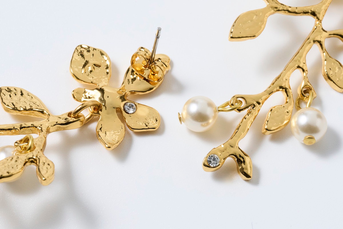 "フルール"="花"のとおり、花びらに優雅な枝葉が揺れるようなエレガントなピアス。花びらの中央でひかえめに光るクリスタルガラスや散りばめられたパールが、女性らしさを引き立てます。