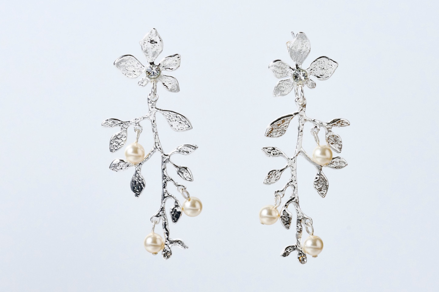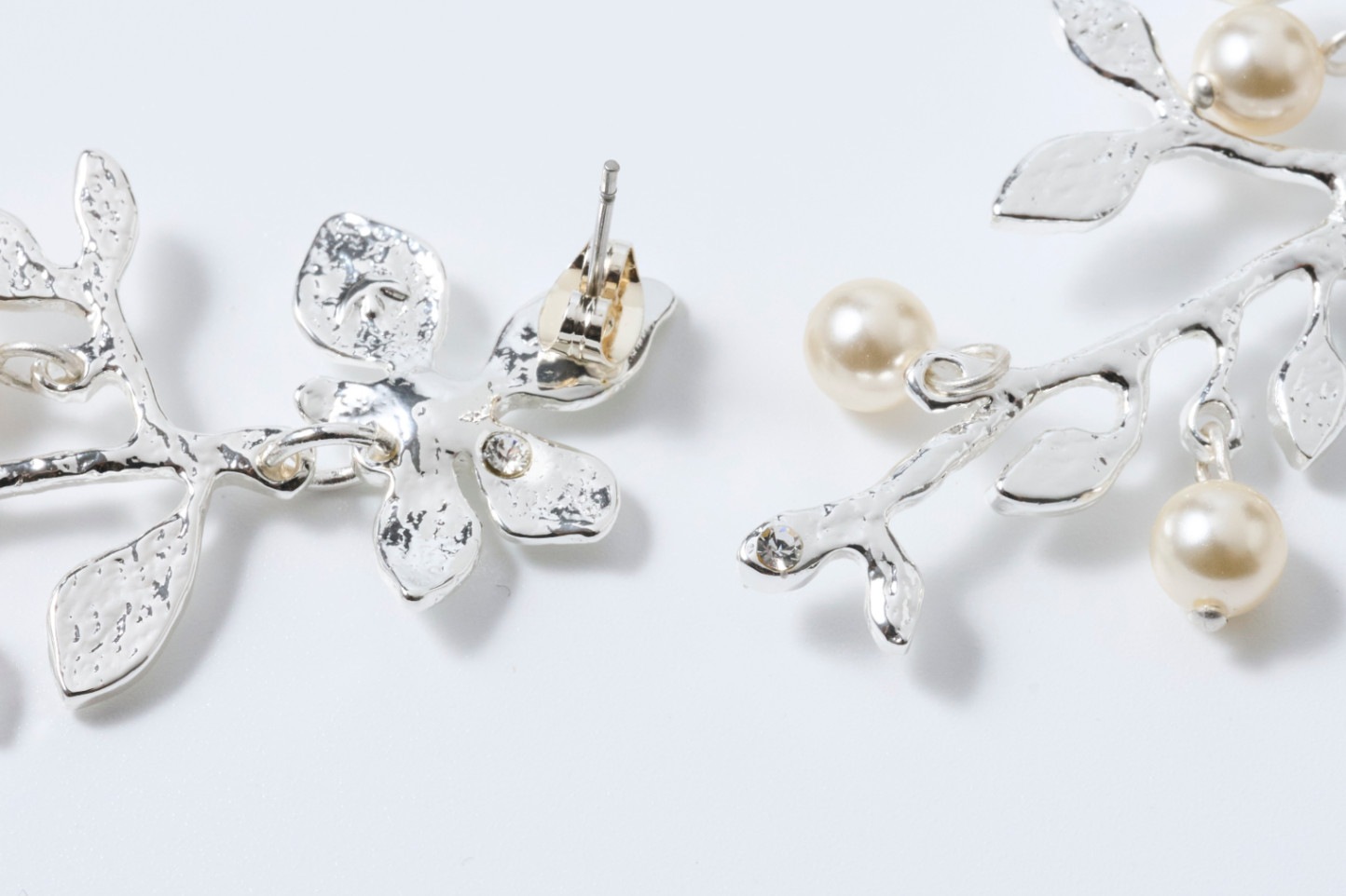 "フルール"="花"のとおり、花びらに優雅な枝葉が揺れるようなエレガントなピアス。花びらの中央でひかえめに光るクリスタルガラスや散りばめられたパールが、女性らしさを引き立てます。