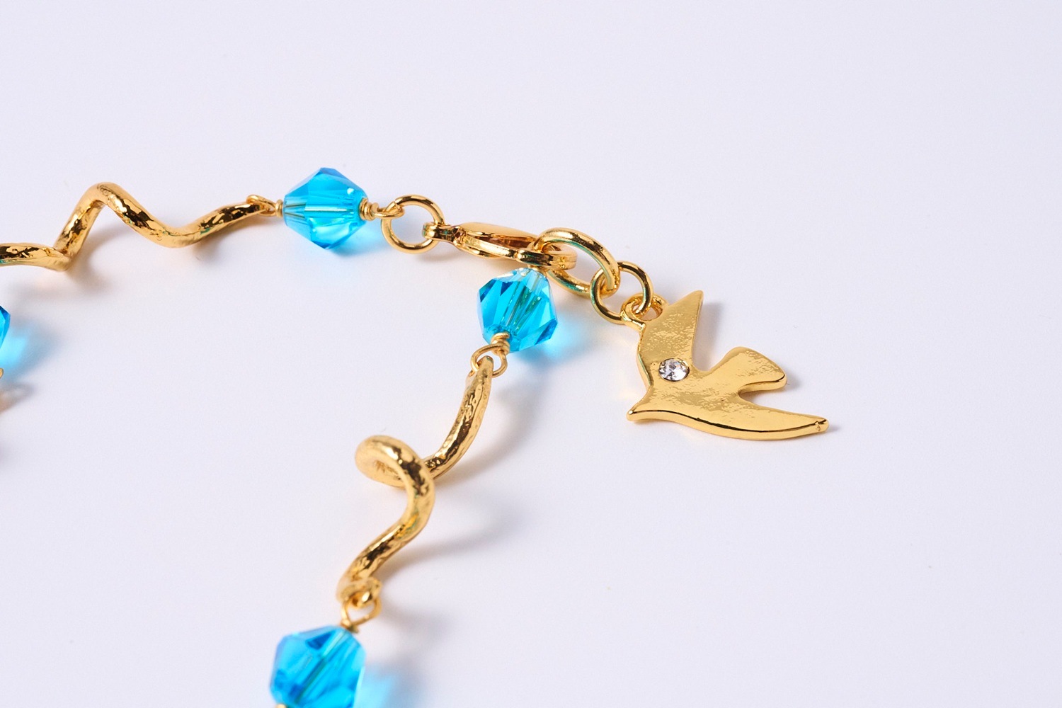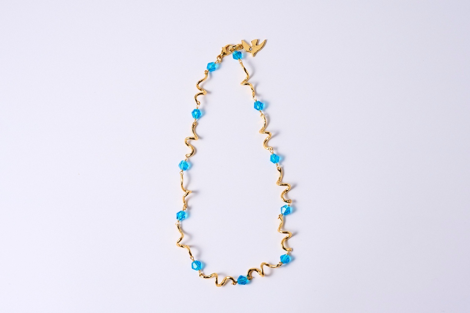 くるくると曲がったゴールドのライン上に、フランスの伝統技法で作られたブルーのガラスがリズミカルに配置されています。