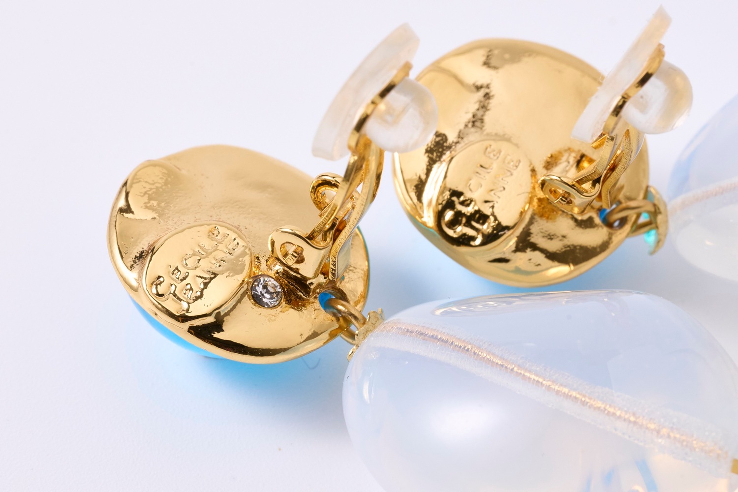 ゴールドの土台に透明感のあるブルーとミルキーホワイトのガラスの組み合わせが、思わず目を引きつけるデザイン。