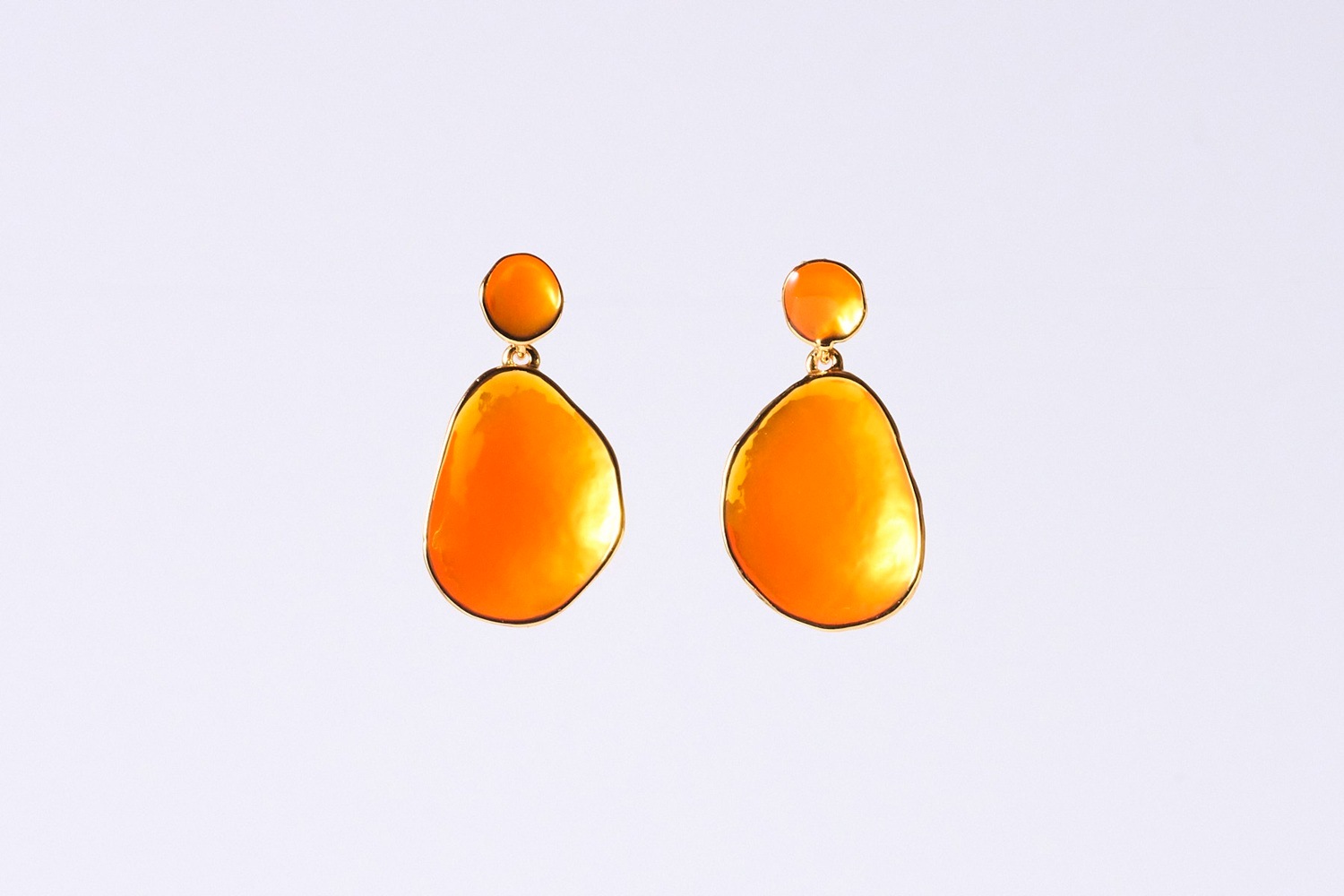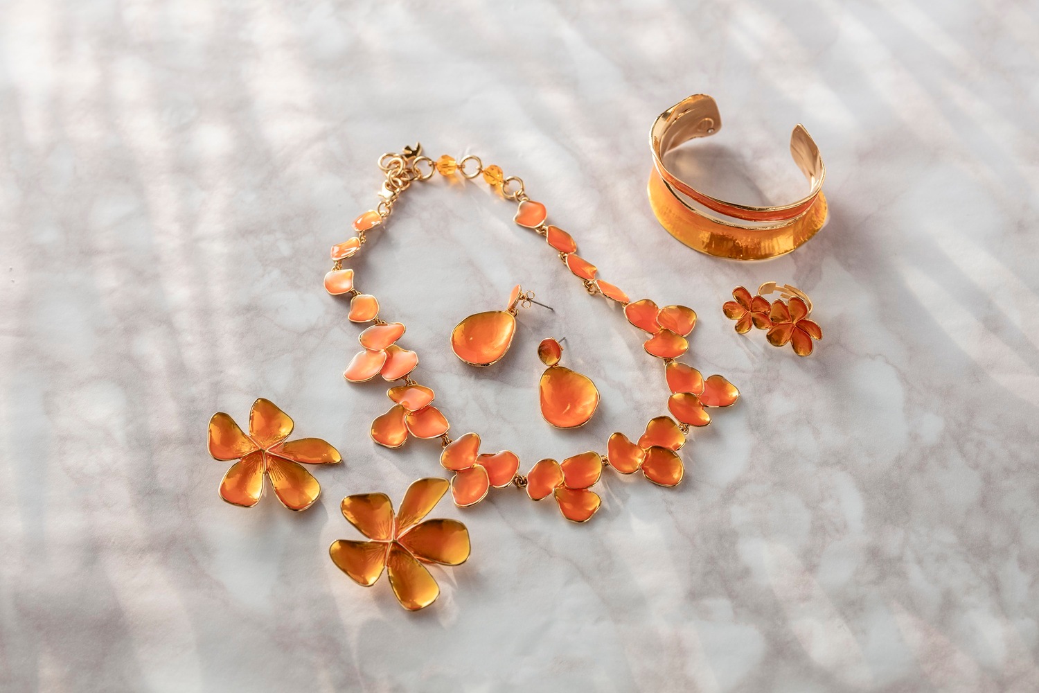 オレンジは、ベージュやブラウンにも合わせやすく、シンプルなドレスやTシャツにつけるだけで引き立つ秀逸なカラーです。