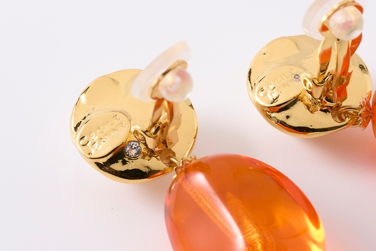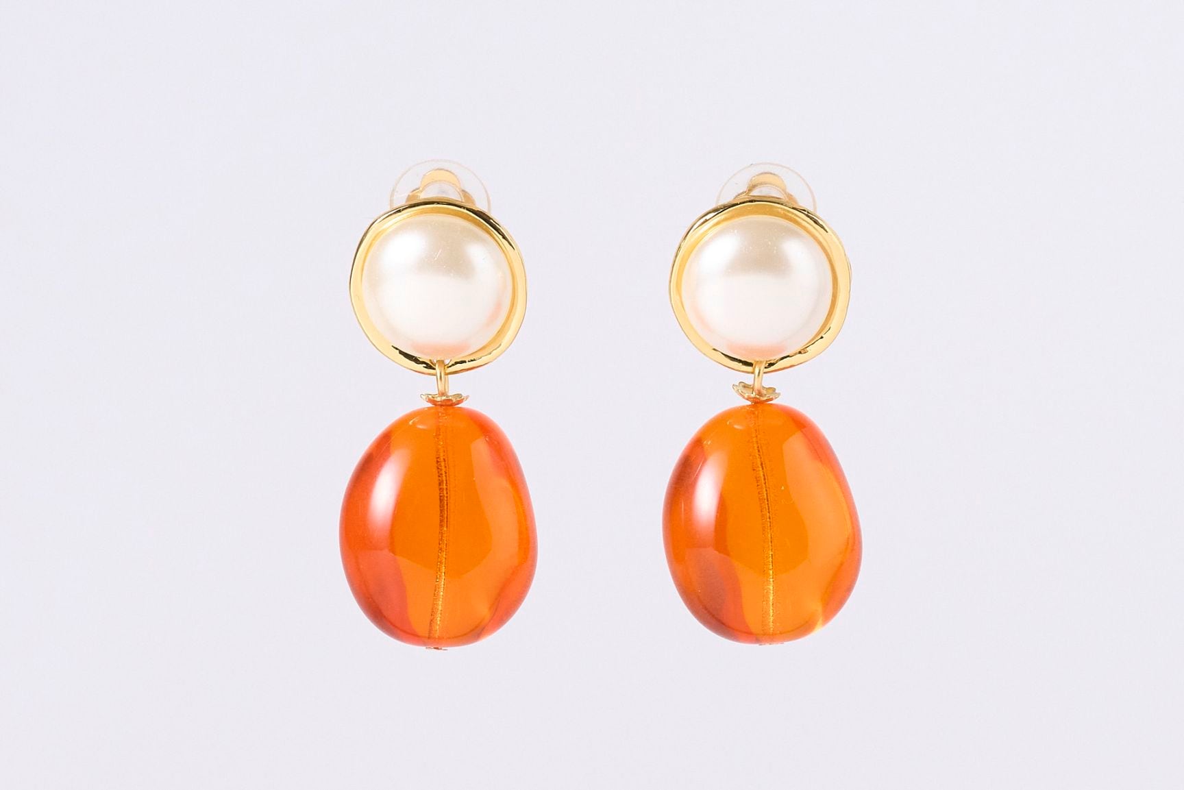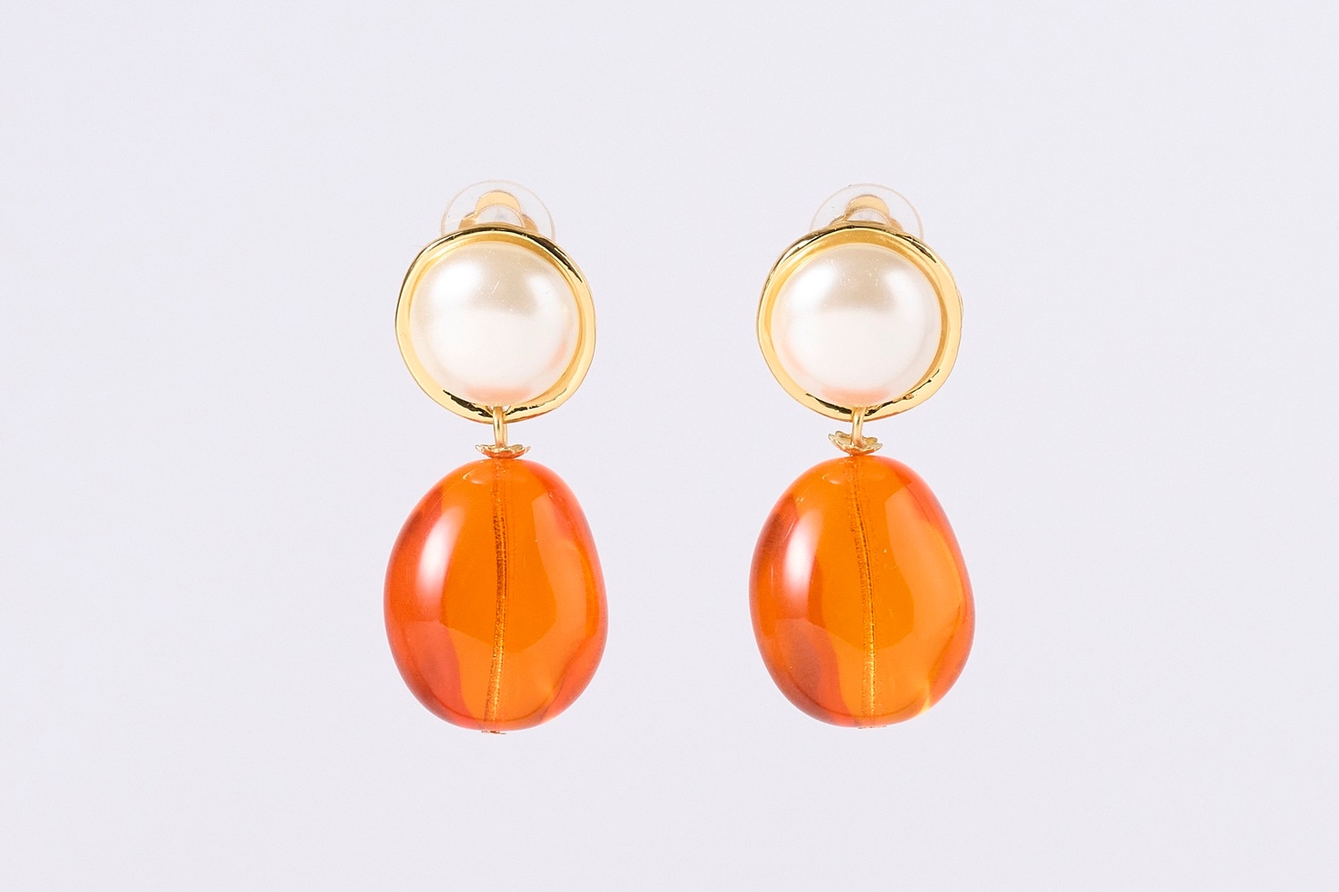 ゴールドの土台に上品なパールとフレッシュなオレンジのガラスの組み合わせが、思わず目を引きつけるデザイン。