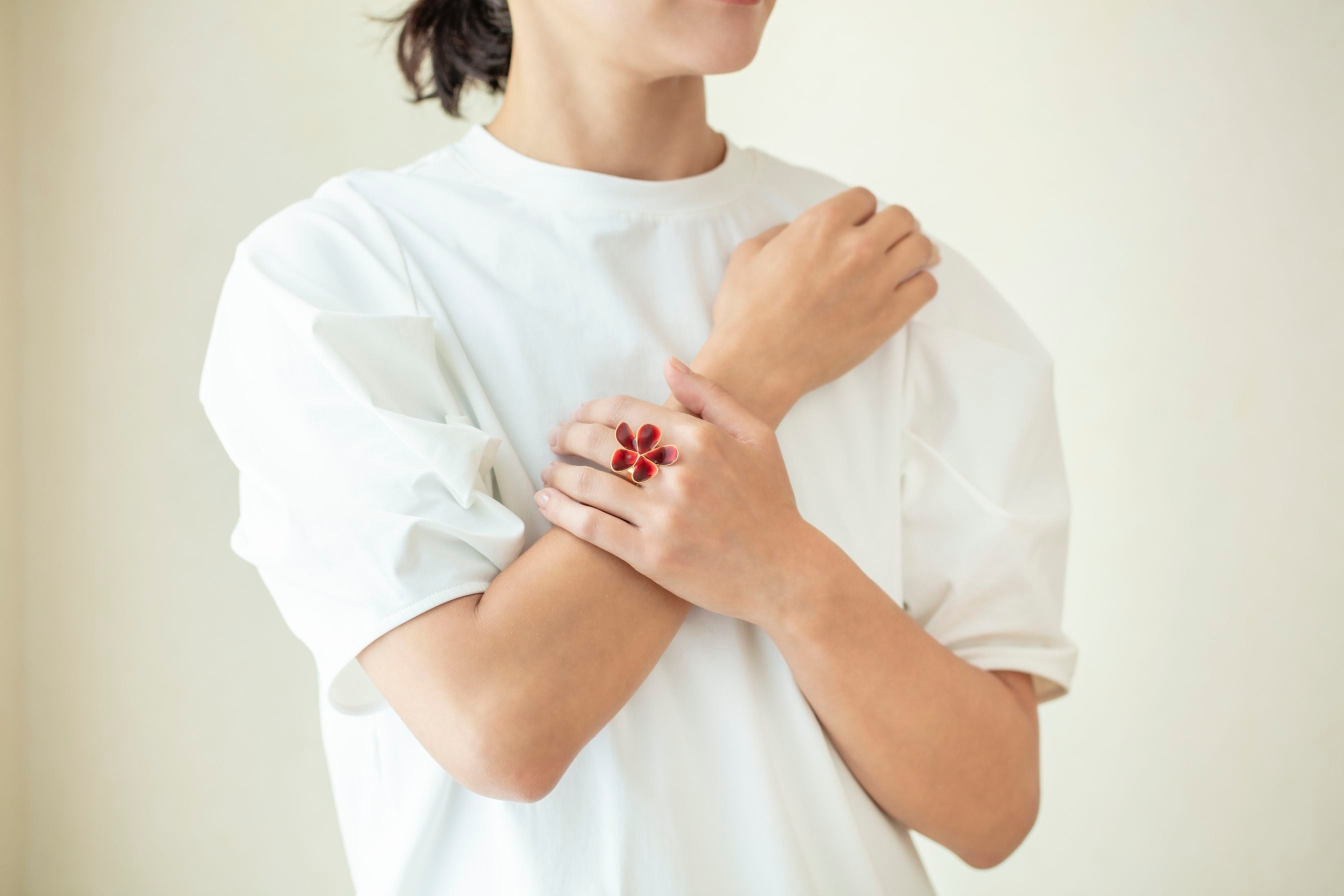 ネイルポリッシュの代わりにもなりそうなルージュレッドが指先に彩りを与え、イヤリングやネックレスとセットでつけるとアクセサリーが主役のスタイリングが完成します。