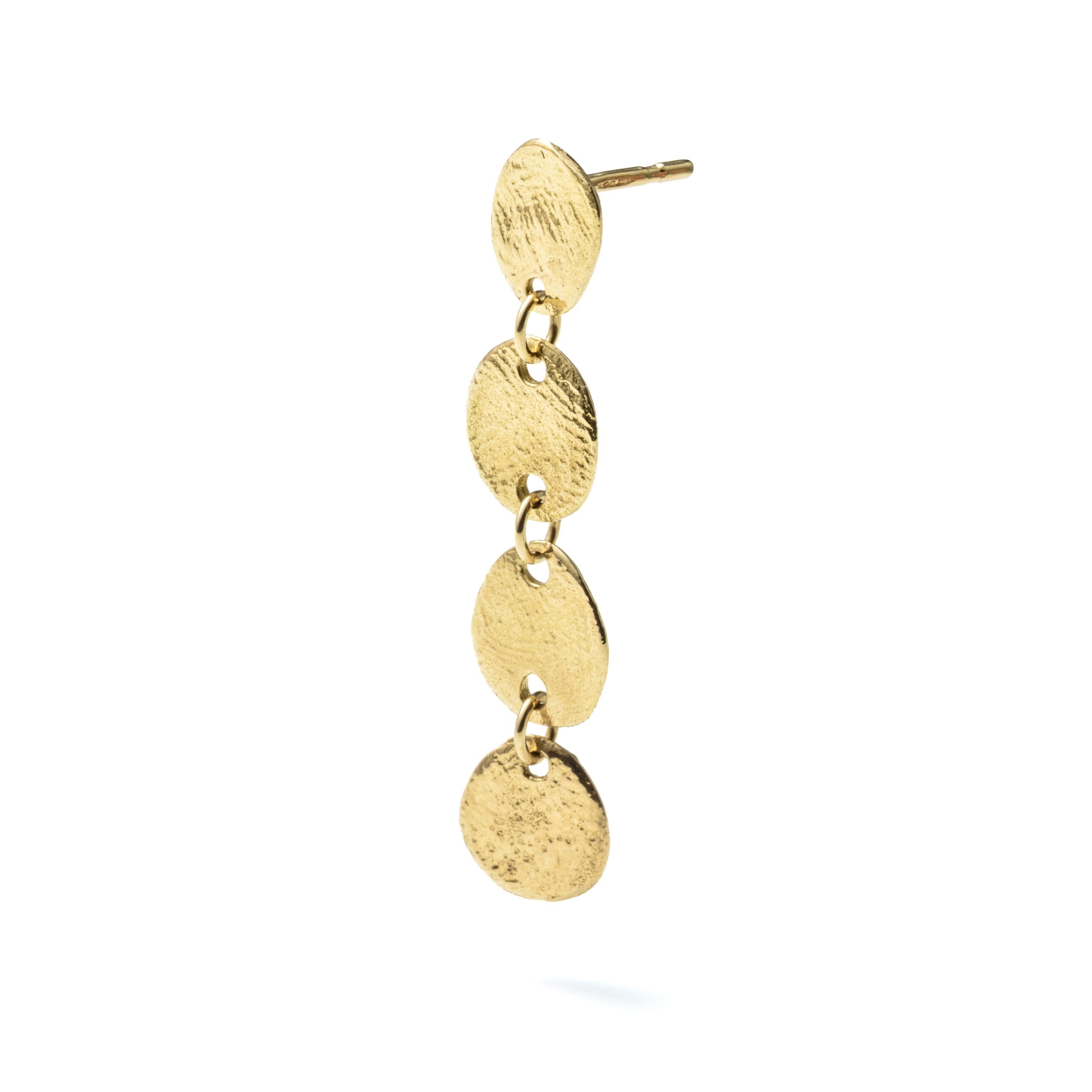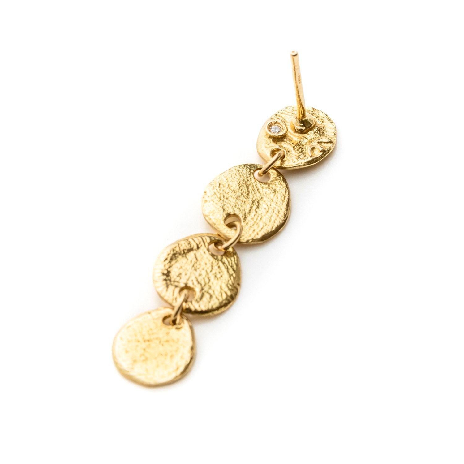左耳の裏側には0.005ctのダイヤモンドがあしらわれ、さりげない上品な輝きが耳元にアクセントを添えます。重さは5gでしっかりとした着け心地ながら、洗練された軽やかさも感じられます。 まるで光そのものをまとったかのように、日常を華やかに彩るピアスです。