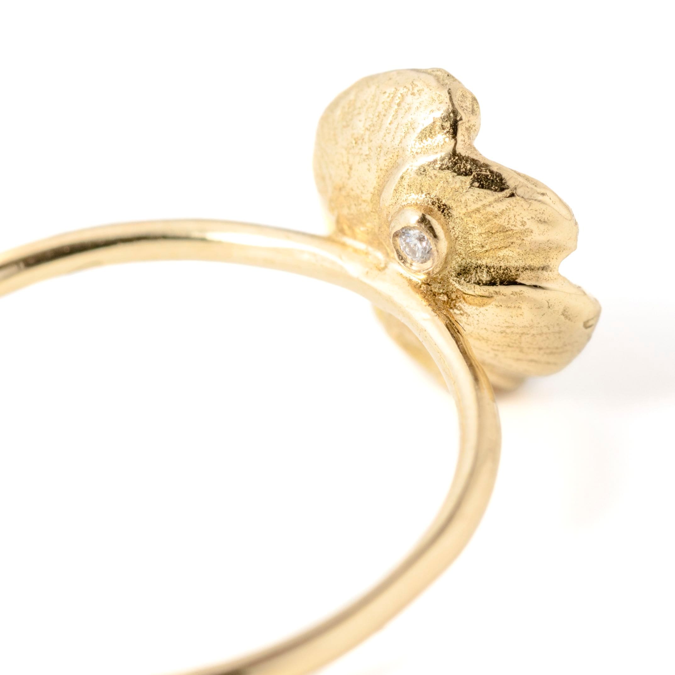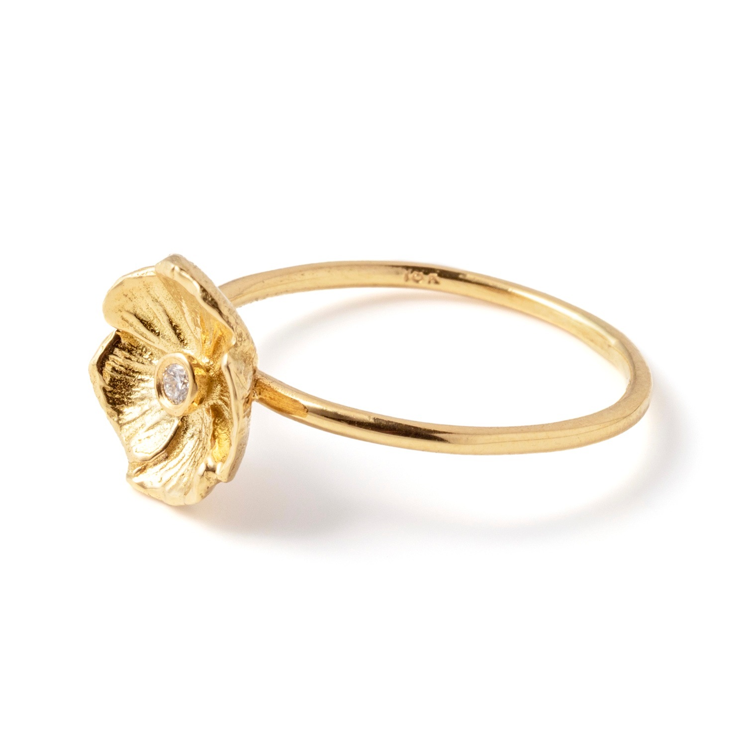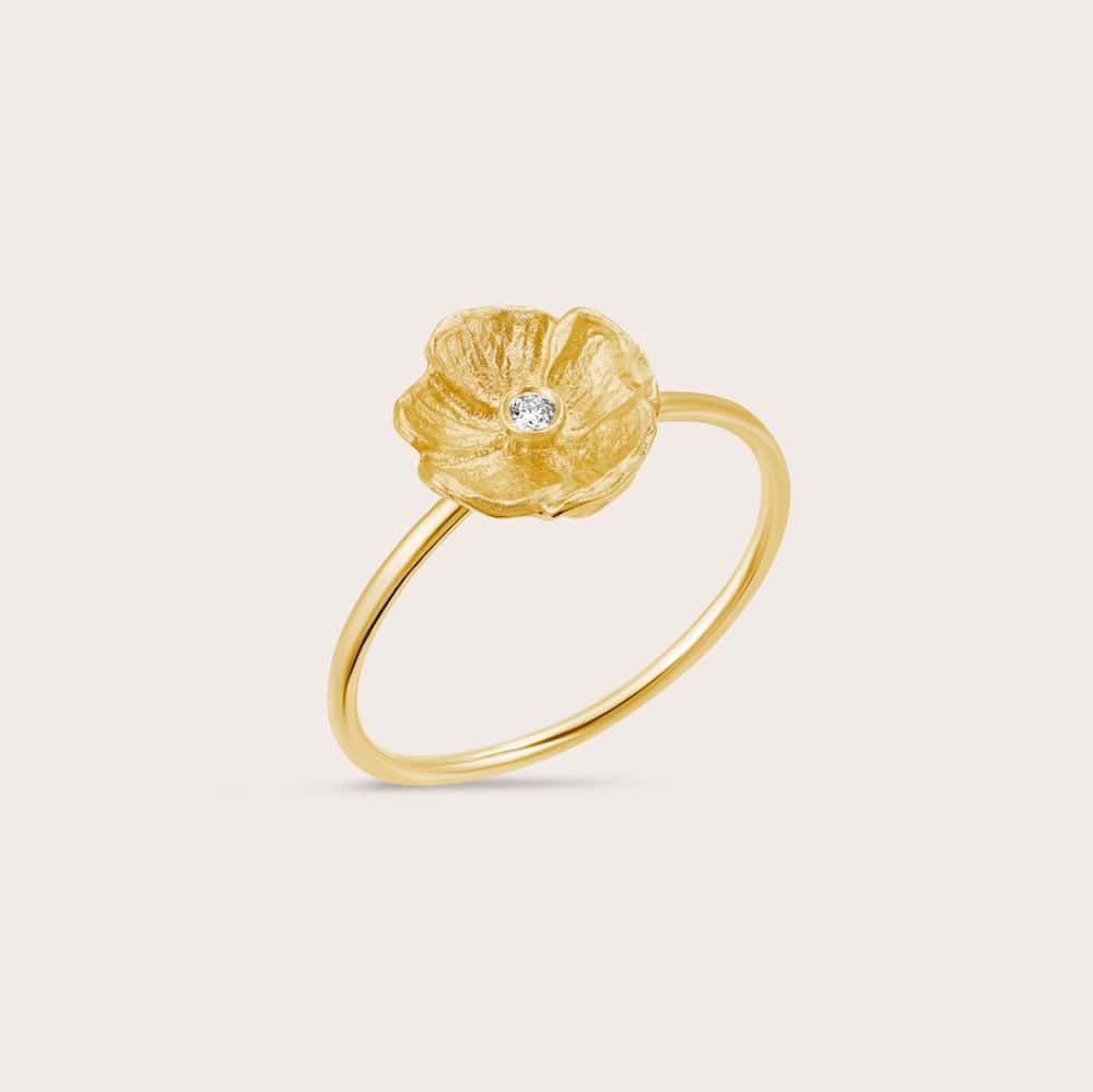 花びらの中心にあしらわれたダイヤモンドは、そっと光をまとったかのように輝き、指元で静かに存在感を放ちます。日常の小さな幸運を呼ぶ「お守り」のように、控えめでありながら確かな存在感を持つデザインです。