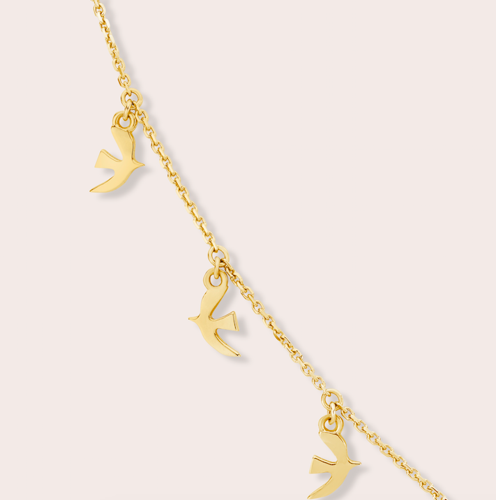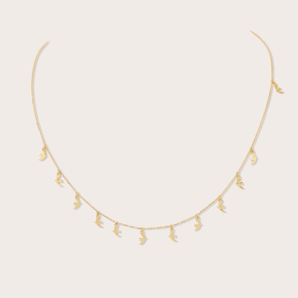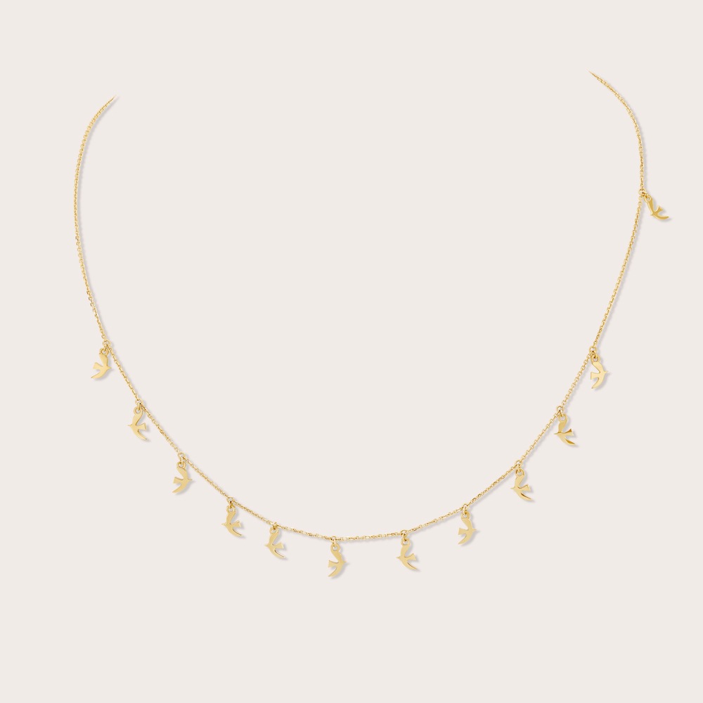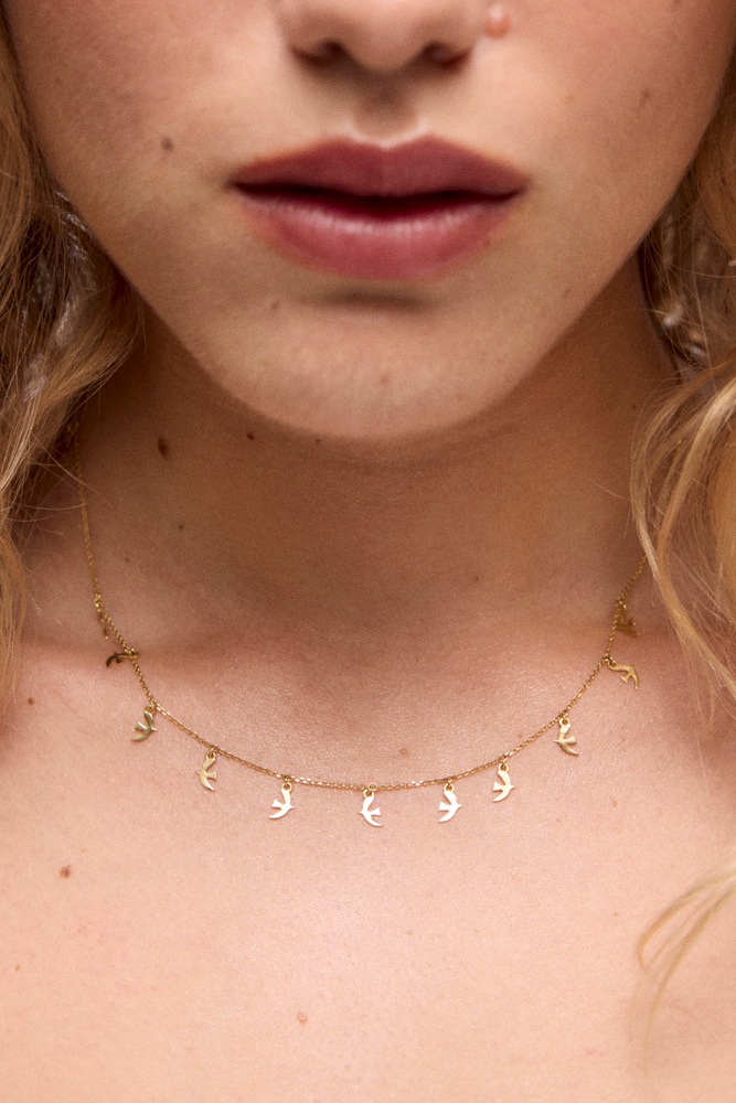 12羽のミニコロンブ(鳩)が連なる、18Kゴールドのネックレス。詩のように美しく繊細なデザインが、身につける人の仕草や光の角度でそっと輝き、見る人の心をふっと揺らします。 小さな鳩は、愛・平和・自由・女性らしさの象徴。日常の装いにはもちろん、特別な日のコーディネートにも寄り添う、まるでお守りのような存在です。 華奢ながら品のある輝きで、単品でも重ね付けでも美しいバランスを演出します。