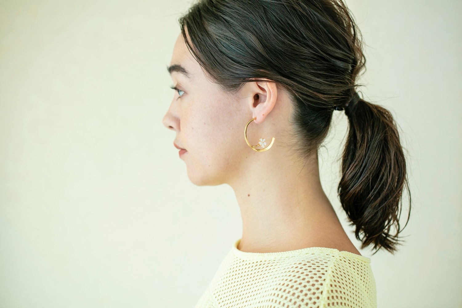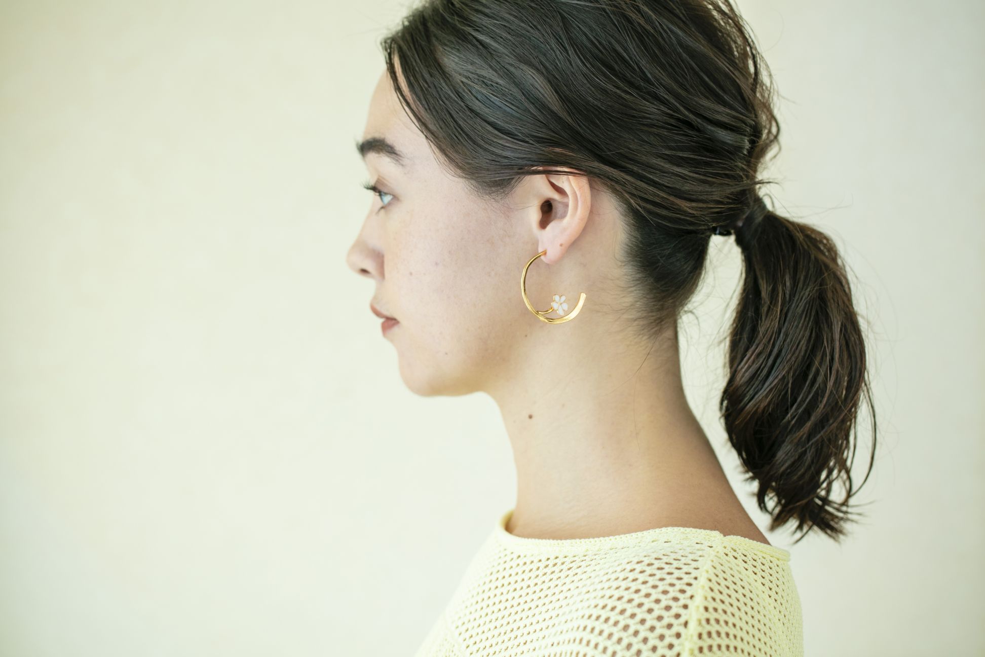 ゴールドのフープにエマイユ(エナメル)ホワイトの花モチーフがあしらわれたピアスが登場。大人の風格と可憐なフルール(花)のコントラストが、唯一無二の存在感を放つ新しいデザインです。