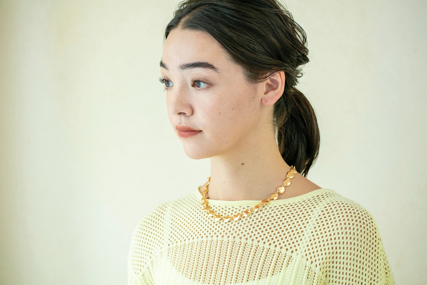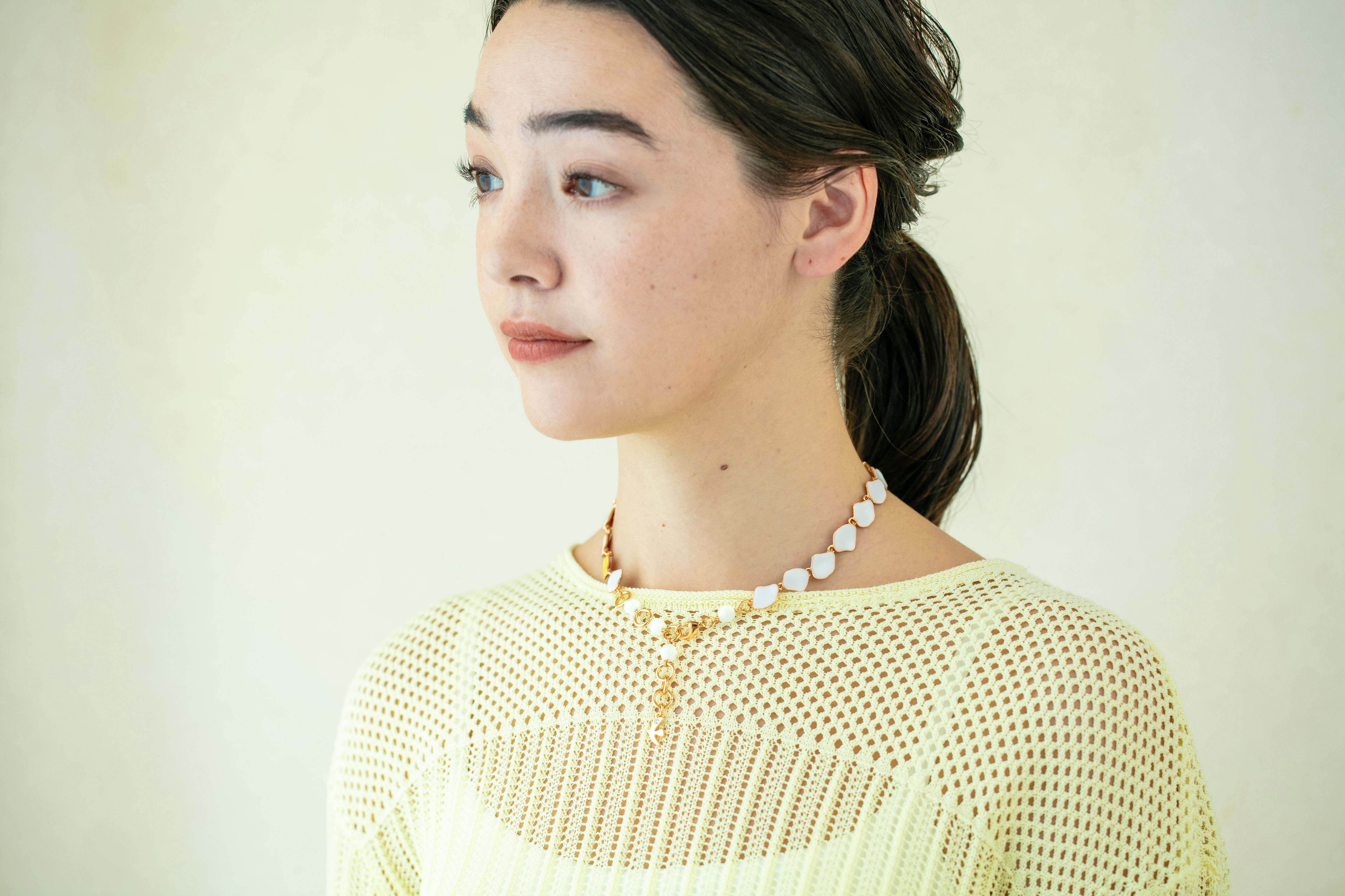 エナメルのプレートが連なるネックレスは、スタイリングを選ばず、同シリーズのイヤリング・ピアスやブレスレットとのコーディネートもおすすめ。